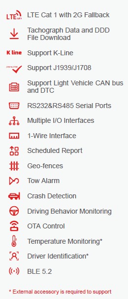 Het toestel is uitgerust met een krachtige voertuiggegevensinterpreter en kan worden aangesloten op bijna alle tachograafmodellen (inclusief D8- en CAN-interfacetachografen) om de tachograafgegevens en DDD-bestanden op afstand te downloaden.